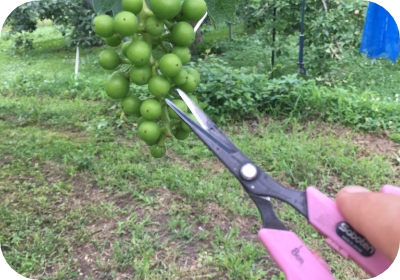 りんご 1月~3月 剪定作業(せんてい) 1月の雪の積もる中から選定作業は始まります。樹形を整えりんごに陽が良く当たり作業がしやすいよう枝を切り詰めます。 ・・・ 4月下旬〜5月上旬 開花~受粉 りんごの花は白くとてもきれいです。花が咲いたら、受粉しなければ、実ができません。その受粉も、他の品種の花粉をつけてあげると良いりんごができます。当園では、蜂と人の手の半々で行っており、筒花蜂を飼育しております。 ・・・ 5月中旬 摘果作業(てっかさぎょう) りんごは、一株に対し5〜6くらいの花が咲きます。しかし、これらすべての花が実(りんご)になると、栄養を行きわたらせるため、中心果と呼ばれる真ん中の実を残し、周囲にある実を落とす作業を摘果と呼びます。 このようにして、一つひとつのりんごに栄養が行き渡り、大きく、おいしいりんごができるわけです。 ・・・ 8月下旬~11月 葉摘み・収穫 りんごに太陽の光を当て、着色を行います。りんごに光を当てるため、りんご周辺の葉をとり(葉摘み)、りんご全体にムラなく光をあてるため、りんごを回転させる玉まわしを行います。 こうして実ったりんごは品種ごとに収穫を行います。 早生種の「シナノリップ」「つがる」の収穫は8月の下旬、中生種の「シナノドルチェ」「シナノスイート」「秋映(あきばえ)」の収穫は10月上旬、そして晩生種の「サンふじ」「名月」「王林」の収穫が11月からといった流れで、それぞれ行われます。これらの作業もすべて手作業で一つひとつキズがつかないよう、丁寧に行っていきます。 収穫時期早見表 一年のスケジュールはあくまで目安となります。気候や天候により変更となる場合もございます。 ぶどう 3月 剪定作業(せんてい) 1年のスタート 樹の養分のバランスを考え切り詰めていきます。 管理のしやすい短梢剪定を取入れ、品質向上と作業の効率化を図っています。 ・・・ 5月上旬 芽吹き~発芽 伸び始めた枝を絡まないようにテープで棚面に留めていきます。 余計な枝を切除したりして、満遍なく日が当たるようにします。 すでに小さなぶどうの房が着いています。 ・・・ 6月上旬 開花~房切り作業 ぶどうの花を見たことがありますか? 小さな房のぶどう一粒一粒によく見ないと分からない程の可愛らしい花が咲きます。 ほんのり甘い香りに蜂も寄ってきます。 この頃に10cm程になっている房を3cmくらいに切り詰める「房切り作業」を行ないます。 これにより充実じた房の元を作ります。 ・・・ 6月上旬 摘粒(てきりゅう)作業 3cmに切り詰めた房が7cm程まで成長した頃、不要な粒を抜く摘粒(てきりゅう)作業で形を整えます。 粒を半分ほどまで減らし更に充実した房をつくります。 この作業が一番、時間がかかりとても神経を使います。 収穫時の形を想像して、ミニチュアのぶどうを完成させていくのを4千~5千房作業します。 ・・・ 7月 袋かけ・笠かけ 摘粒作業終了後に房を病気や日差しから守るため、早めに袋かけ傘かけをし収穫を待ちます。 ・・・ 10月 収穫・出荷 シャインマスカットは黄緑色程度に黄色みが差してきて糖度があがった物から収穫します。 当園地は標高が600mと高地にあるため収穫期は遅いのですが、できるだけ遅くまで樹に成らせる事で熟成を図ります。